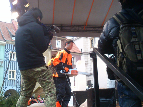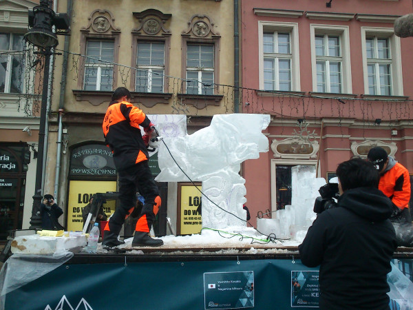午後になると会場の旧市街広場には製作過程を見ようとするポズナン市民が集まり、夕方ぐらいからは家族連れやカップルで信じられないほどごった返しました。競技終了後には氷彫刻は様々な色のイルミネーションでライトアップされ、まるでガラスか水晶で出来ているかのような精巧な彫刻に、人々は感嘆の声を上げていました。