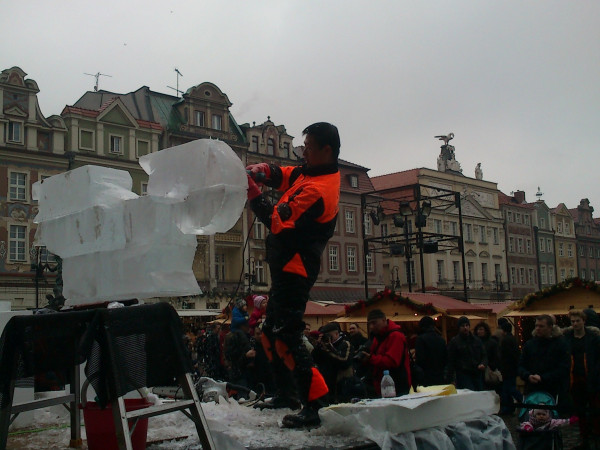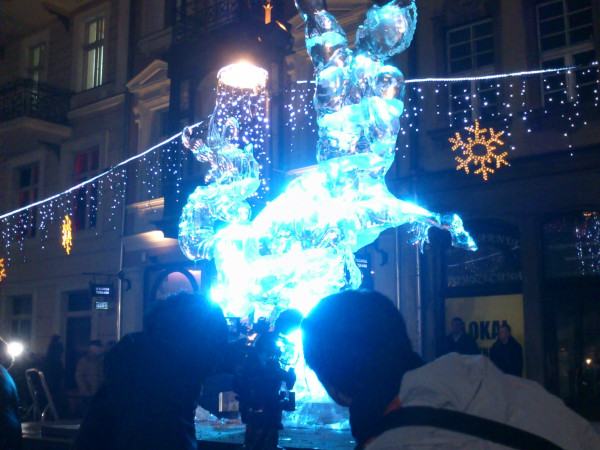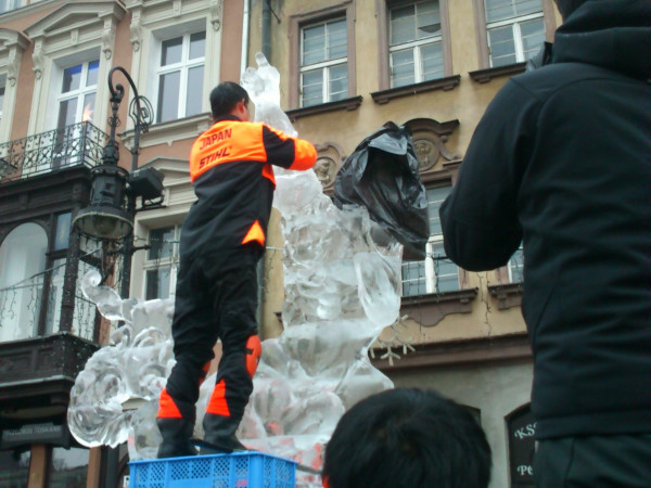このフェスティバルは2006年からポズナン市で毎年12月中旬の週末に行われているもので、ヨーロッパからだけでなくアメリカやカナダ、日本、はてはマレーシアなどから精鋭のアイスカーバーたちが集まります。氷彫刻のイベントとしてはポーランド最大のものです。