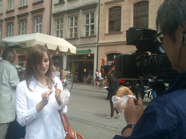 Pierwsza osoba, z którą się spotkaliśmy to Klaudia – studentka Uniwersytetu Jagiellońskiego, a dokładniej japonistyki. Odwiedziliśmy Zamek Królewski i Stare Miasto, gdzie zawsze jest mnóstwo turystów. Wspinaliśmy się również na szczyt Wieży Mariackiej gdzie rozbrzmiewa codziennie grany na trąbce hejnał Mariacki, a jego historię opowiedział nam na szczycie sam hejnalista.