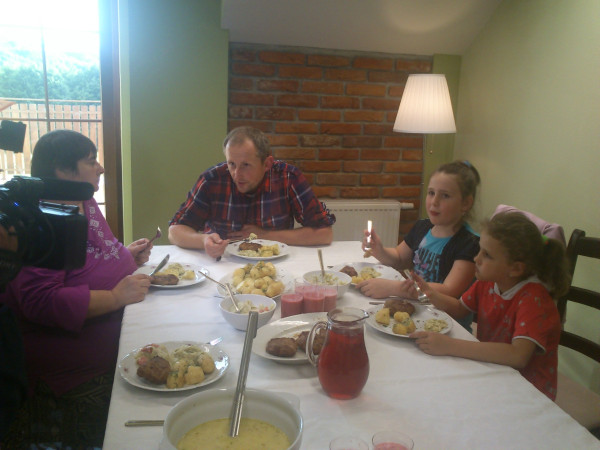 クラウディアさんとはここでお別れし、農家を営むヤンさんにナビゲーターをバトンタッチ。クラクフ市民に大人気の市場を一緒に回ったあとは彼の自宅で夕食をご馳走になりました。無農薬野菜を作っているほかにも酪農用の牛を飼っているヤンさんのお宅では、牛乳やヨーグルト、生クリーム、バターなどは全部手作りしています。どれも手作りなだけあり、売っているものとは比べ物にならないほど味が濃厚。奥さんのバーシャさんがそれらを惜しげもなく使い、とてもおいしい家庭料理を作ってくれました。